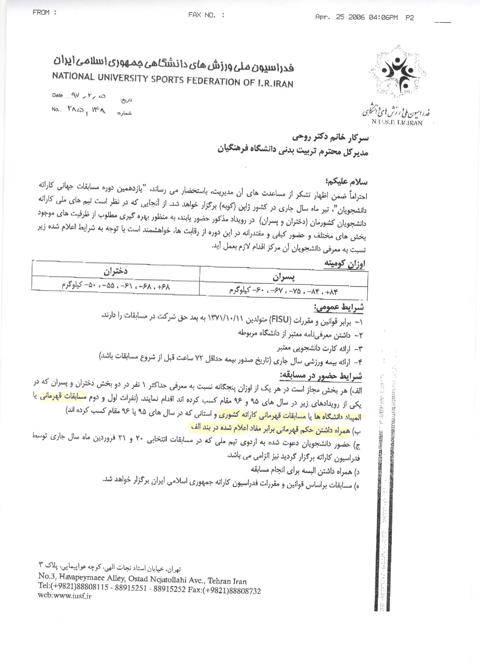 - برای اطلاع بیشتر با شماره تلفن 88915250 – 021 فدراسیون ملی ورزش های دانشگاهی و 09136182582 تماس حاصل نمایید.