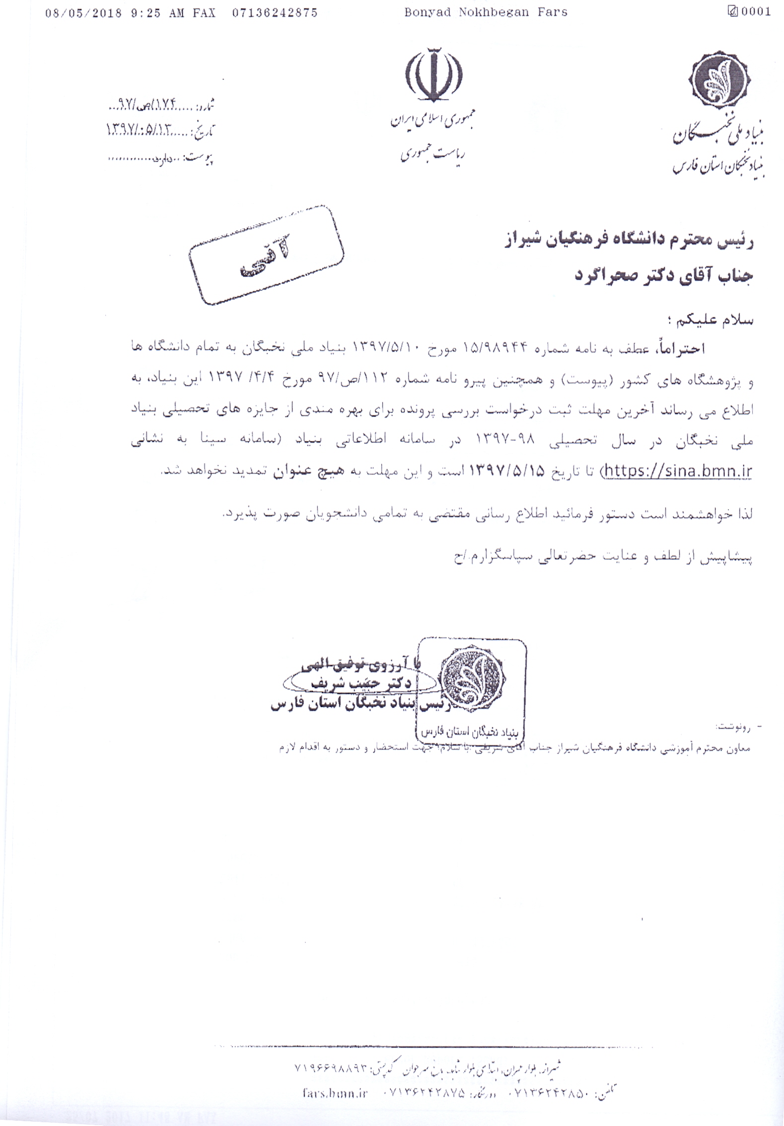 نامه شماره 174/ص/97 مورخ 13/5/97 بنیاد نخبگان استان فارس مبنی بر ثبت درخواست بررسی پرونده برای بهرهمندی از جایزههای تحصیلی بنیاد ملی نخبگان در سال تحصیلی جدید در سامانه اطلاعاتی این بنیاد