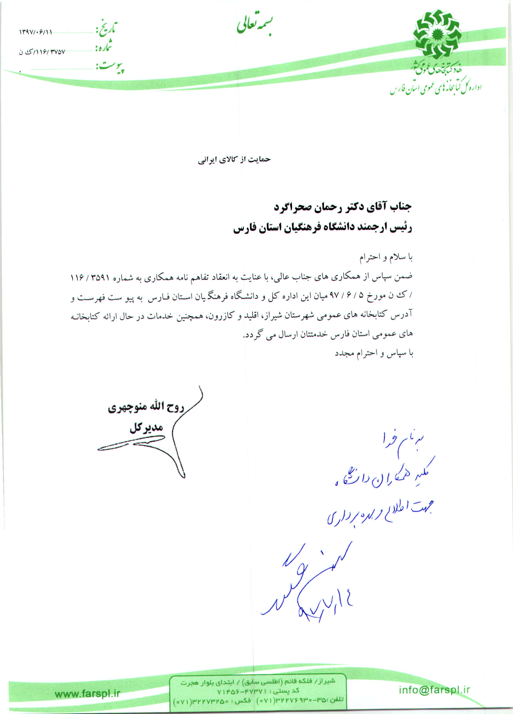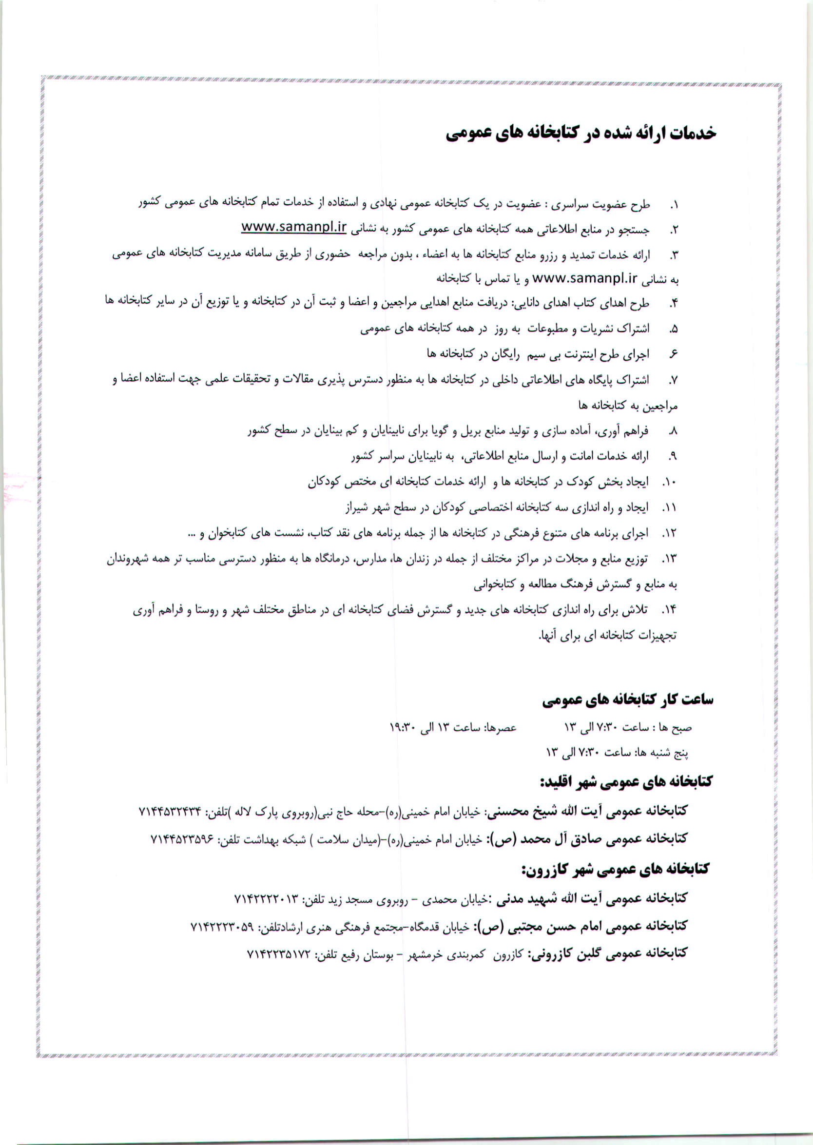 با توجه به تفاهم نامه منعقد شده با مدیر کل محترم کتابخانه های عمومی استان فارس مبنی بر خدمات قابل ارائه، فهرست و آدرس کتابخانههای عمومی شهرستان شیراز، اقلید و کازرون جهت اطلاع و بهره برداری کلیه همکاران، اساتید و دانشجویان دانشگاه اعلام می گردد