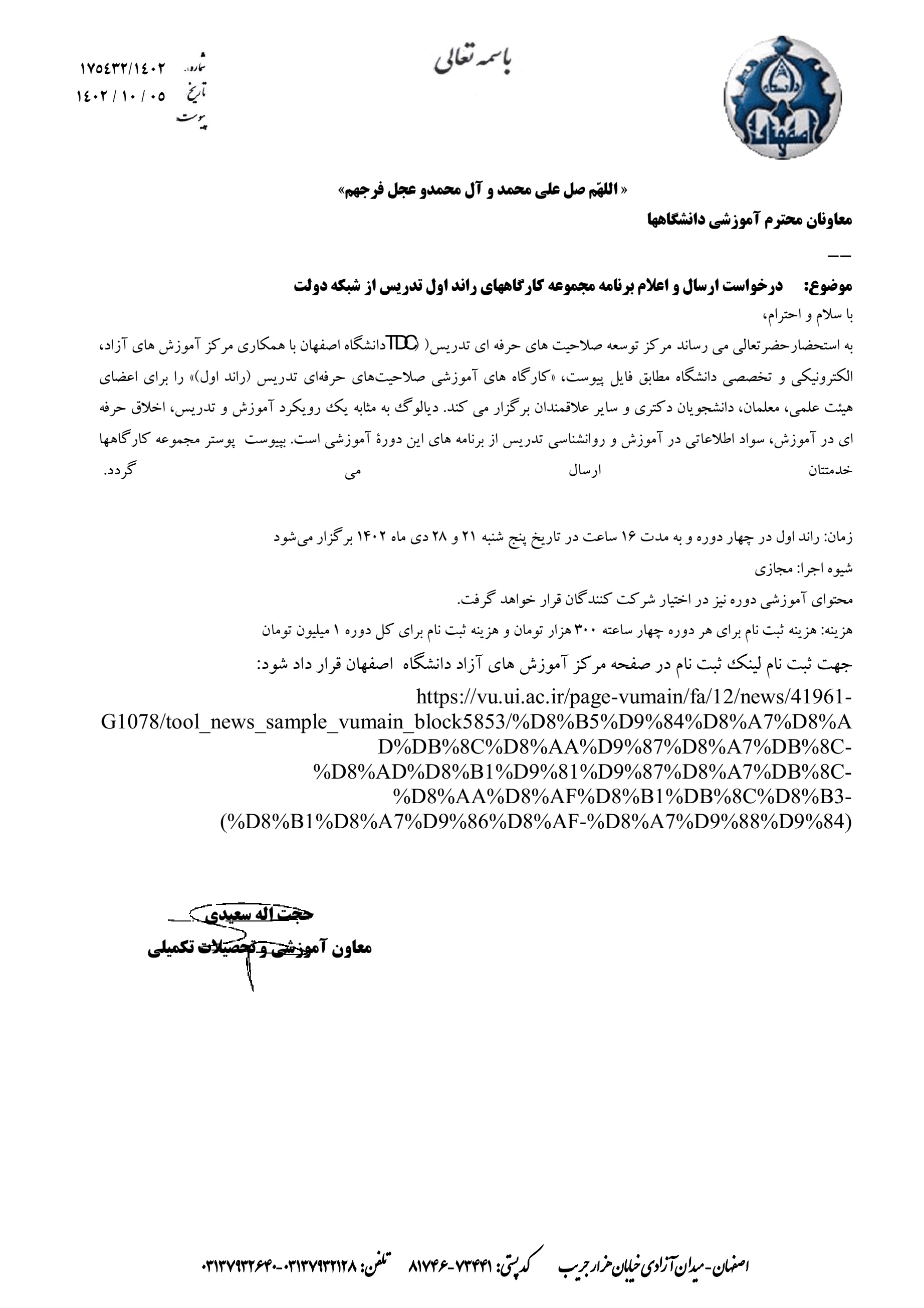 کارگاههای آموزشی با موضوعات “دیالوگ به مثابه یک رویکرد آموزشی در تدریس"،" اخلاق حرفهای در آموزش"، "سواد اطلاعاتی در آموزش" و "روانشناسی تدریس" ویژه اعضای هیات علمی و مدرسان جهت اطلاع اعلام می گردد