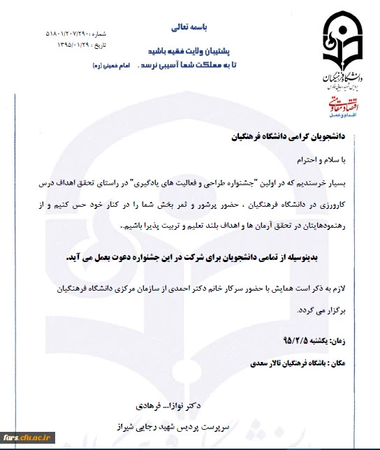 دعوت از تمامی دانشجویان دانشگاه فرهنگیان فارس براس شرکت در اولین جشنواره طراحی و فعالیت های یادگیری 2