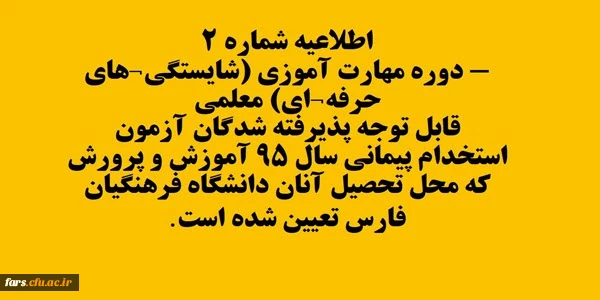 اطلاعیه شماره 2- دوره مهارت آموزی (شایستگی های حرفه ای) معلمی قابل توجه پذیرفته شدگان آزمون استخدام پیمانی سال 95 آموزش و پرورش که محل تحصیل آنان دانشگاه فرهنگیان فارس تعیین شده است. 2