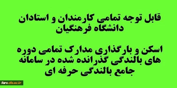 قابل توجه تمامی کارمندان و استادان دانشگاه فرهنگیان اسکن و بارگذاری تمامی دوره های بالندگی گذرانده شده در سامانه جامع بالندگی حرفه ای 2