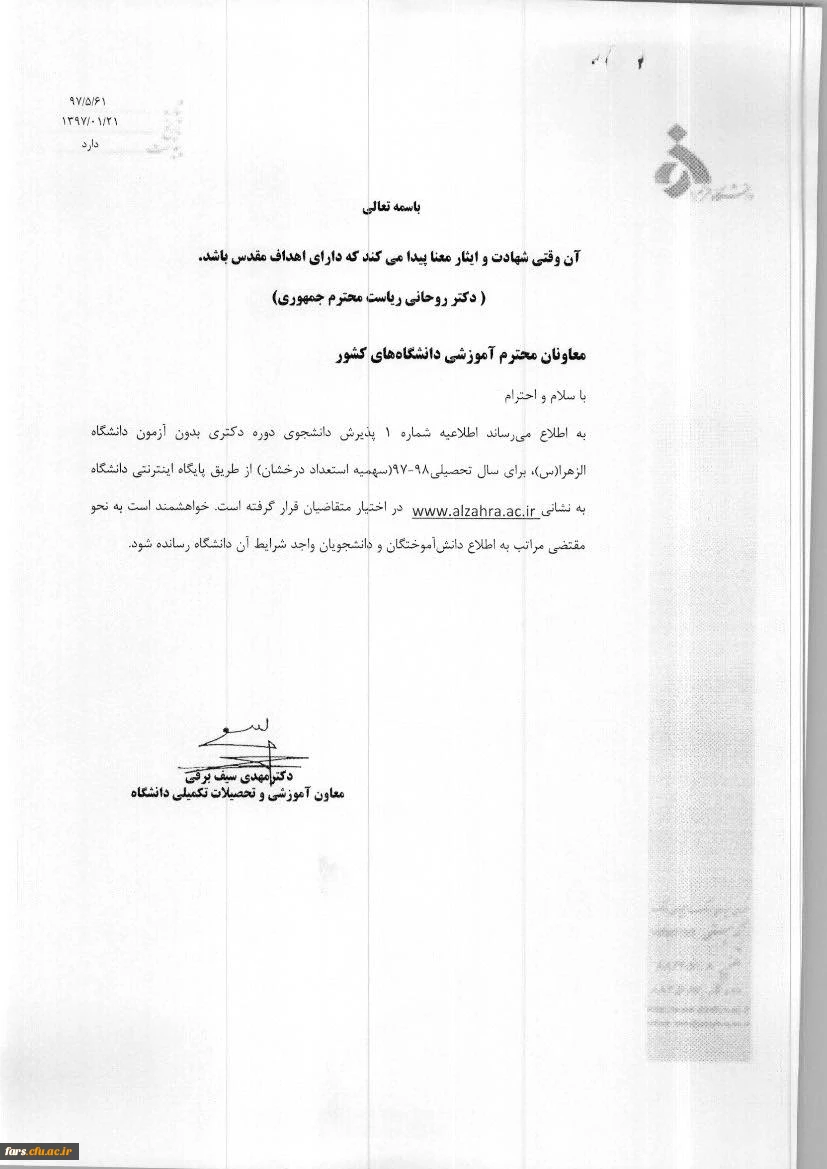 فراخوان پذیرش بدون آزمون دوره دکتری دانشگاه الزهراء (س) 2