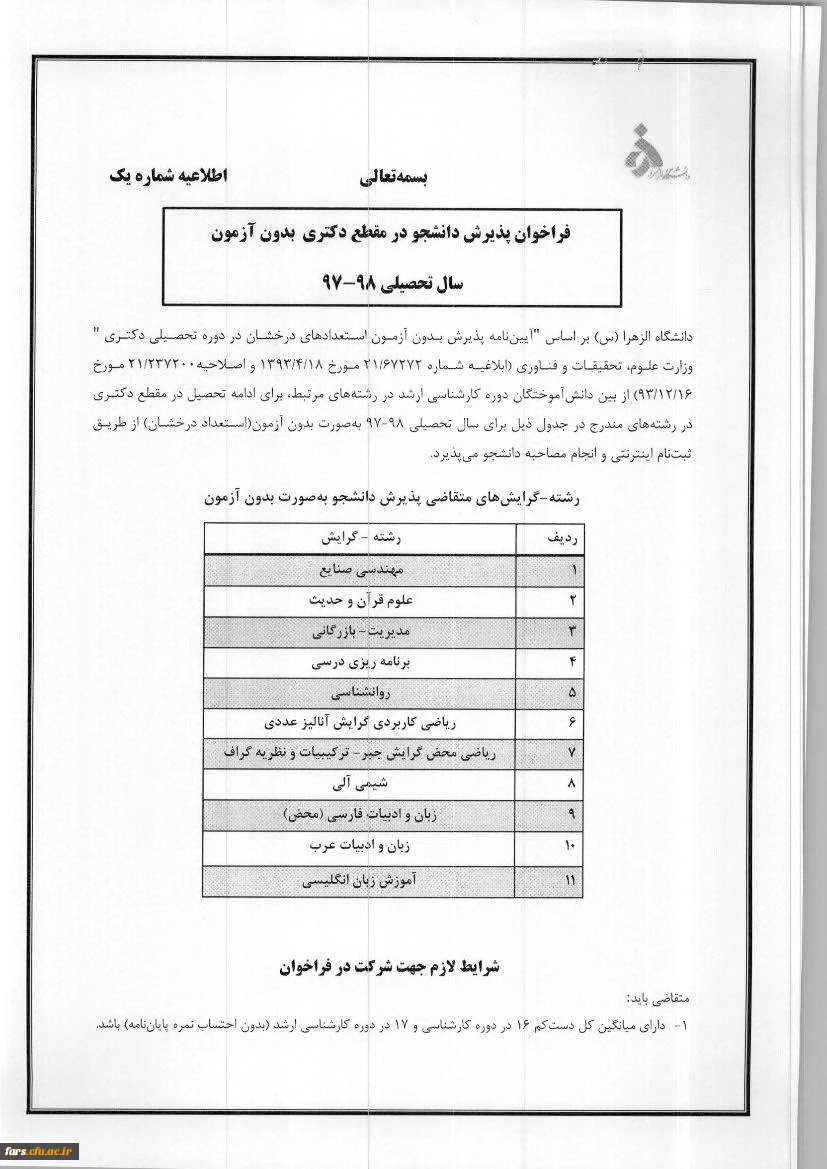 امتیاز دهید : فراخوان پذیرش بدون آزمون دوره دکتری دانشگاه الزهراء (س) 2 دوشنبه 27 فروردین 1397 ساعت 15:16