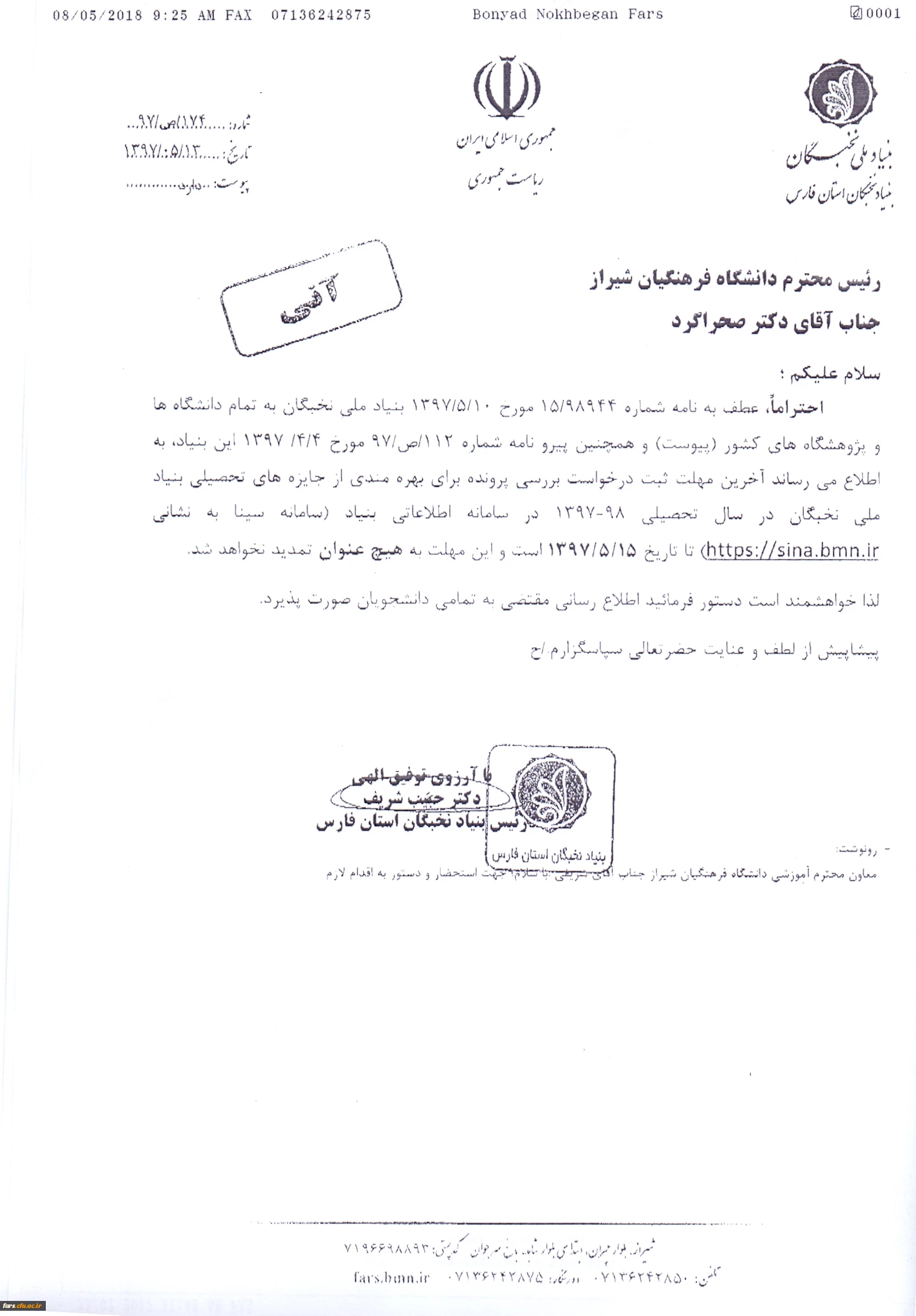 امتیاز دهید : ثبت درخواست بررسی پرونده برای بهره مندی از جایزه های تحصیلی بنیاد ملی نخبگان 2 دوشنبه 15 مرداد 1397 ساعت 7:02