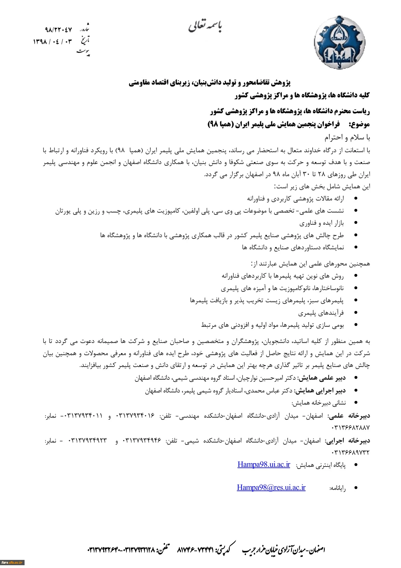 فراخوان پنجمین همایش ملی پلیمر ایران (همپا 98) 2