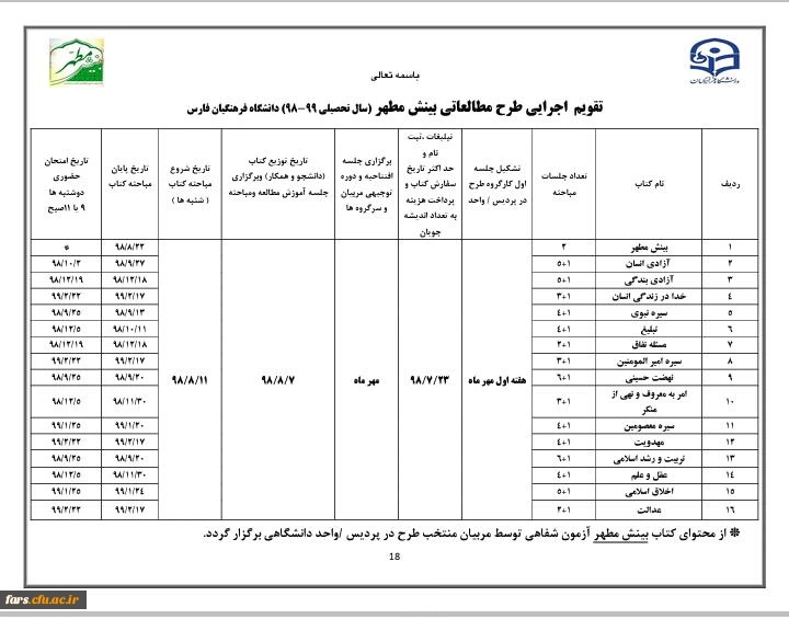 امتیاز دهید : تقویم اجرایی طرح مطالعاتی بینش مطهر (سال تحصیلی 99-98 ) دانشگاه فرهنگیان فارس 2 جمعه 12 مهر 1398 ساعت 1:04