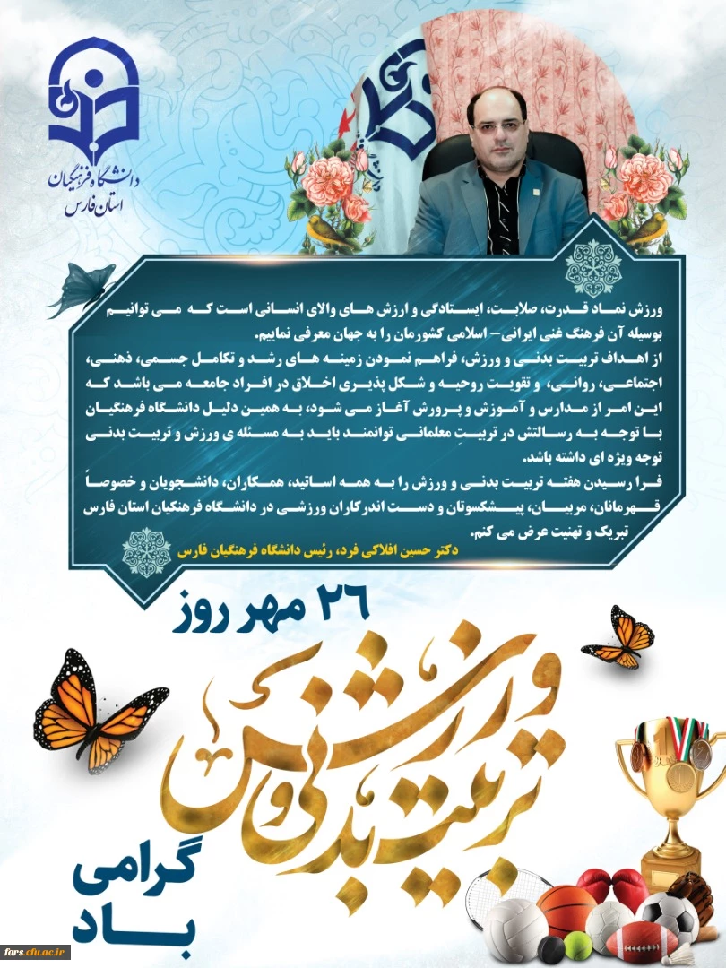 پیام دکتر افلاکی فرد ریاست دانشگاه فرهنگیان فارس بمناسبت هفته ورزش و تربیت بدنی 2