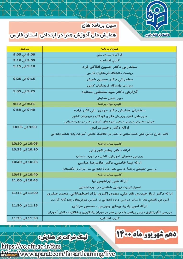 امتیاز دهید : برگزاری نخستین همایش مجازی آموزش هنر در ابتدایی به همت دانشگاه فرهنگیان فارس 3 چهارشنبه 10 شهریور 1400 ساعت 16:27