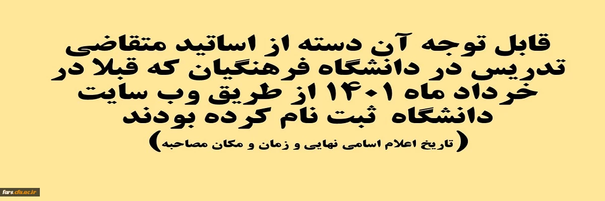 قابل توجه آن دسته از اساتید متقاضی تدریس در دانشگاه فرهنگیان که قبلا در خرداد ماه 1401 از طریق وب سایت دانشگاه ثبت نام کرده بودند 2