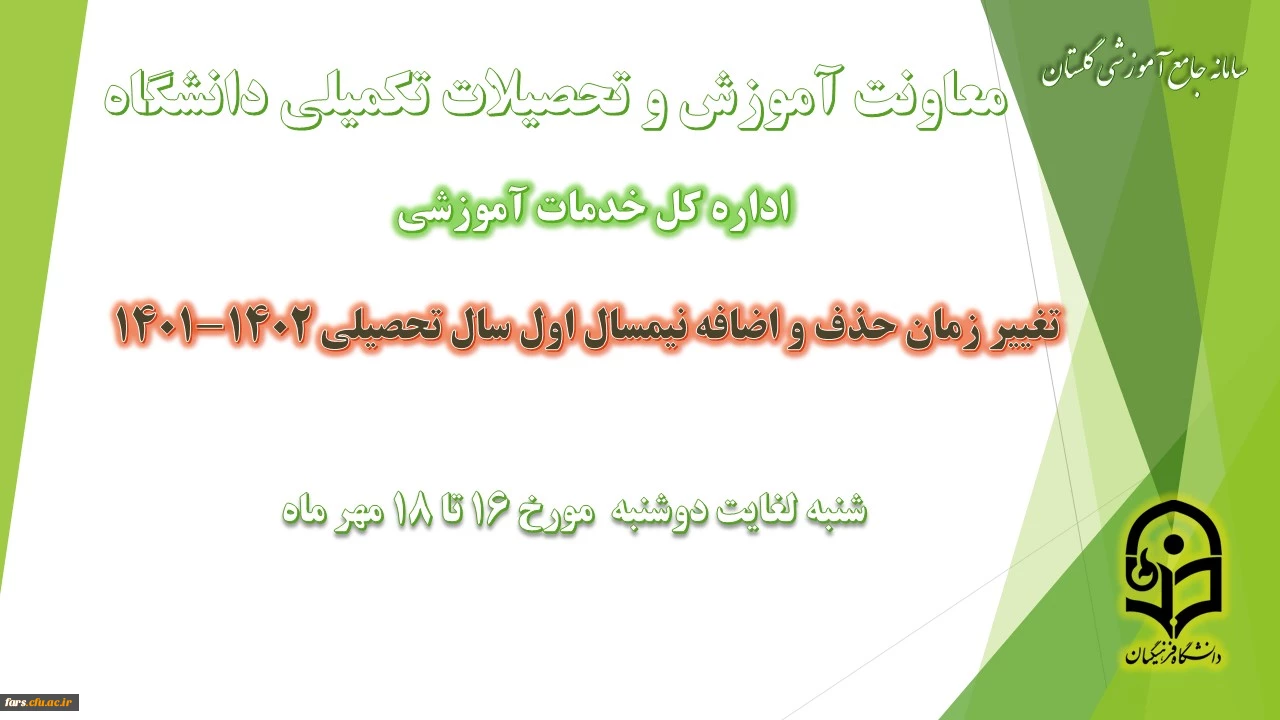 امتیاز دهید : تغییر بازه زمانی حذف و اضافه در نیمسال اول سال تحصیلی 1402-1401 2 یکشنبه 10 مهر 1401 ساعت 8:59