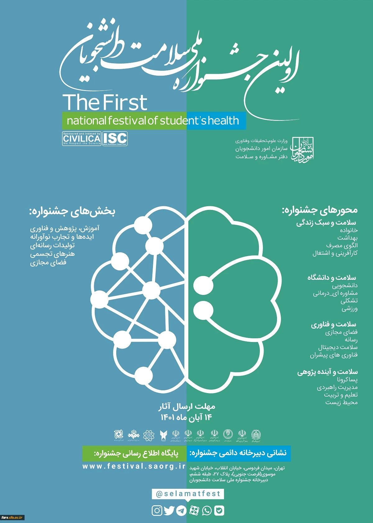 مهلت ارسال آثار به دبیرخانه در اولین جشنواره ملی سلامت روان دانشجویان کشور تا تاریخ 14 بهمن ماه سال جاری تمدید شد. 3