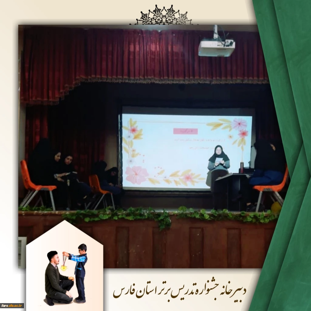 برگزاری مرحله استانی جشنواره تدریس برتر به گزارش روابط عمومی دانشگاه فرهنگیان، واحد دانشگاهی سلمان فارسی شیراز، روز دوشنبه و سه شنبه، یازدهم و دوازدهم اردیبهشت ماه سال جاری ، مرحله استانی جشنواره تدریس برتر در واحد دانشگاهی سلمان فارسی شیراز برگزار گردید