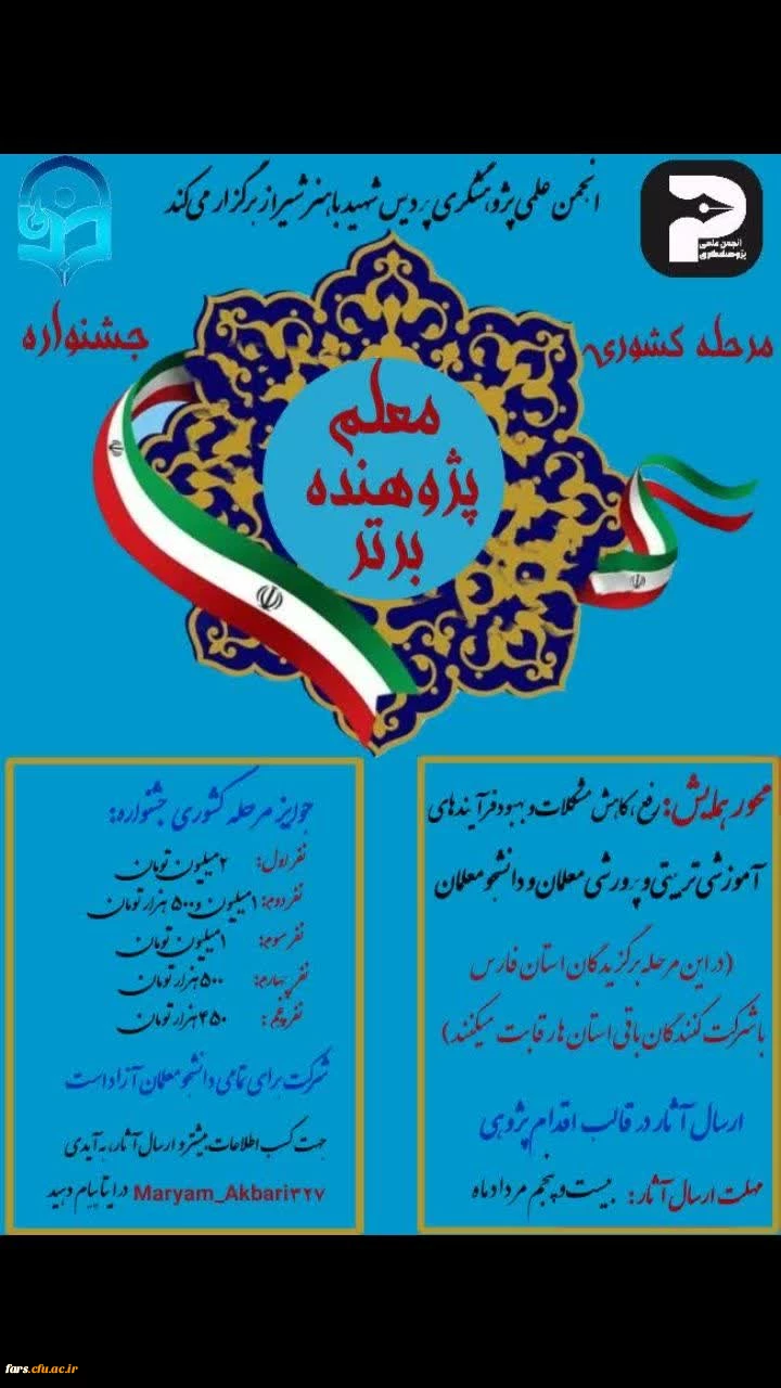 امتیاز دهید : انجمن علمی پژوهشگری پردیس شهید باهنر شیراز برگزار میکند: 2 چهارشنبه 11 مرداد 1402 ساعت 12:22
