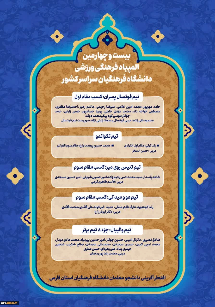 افتخار آفرینی دانشجو معلمان پسر دانشگاه فرهنگیان استان فارس در بیست و چهارمین المپیاد فرهنگی ورزشی دانشگاه فرهنگیان سراسر کشور 2