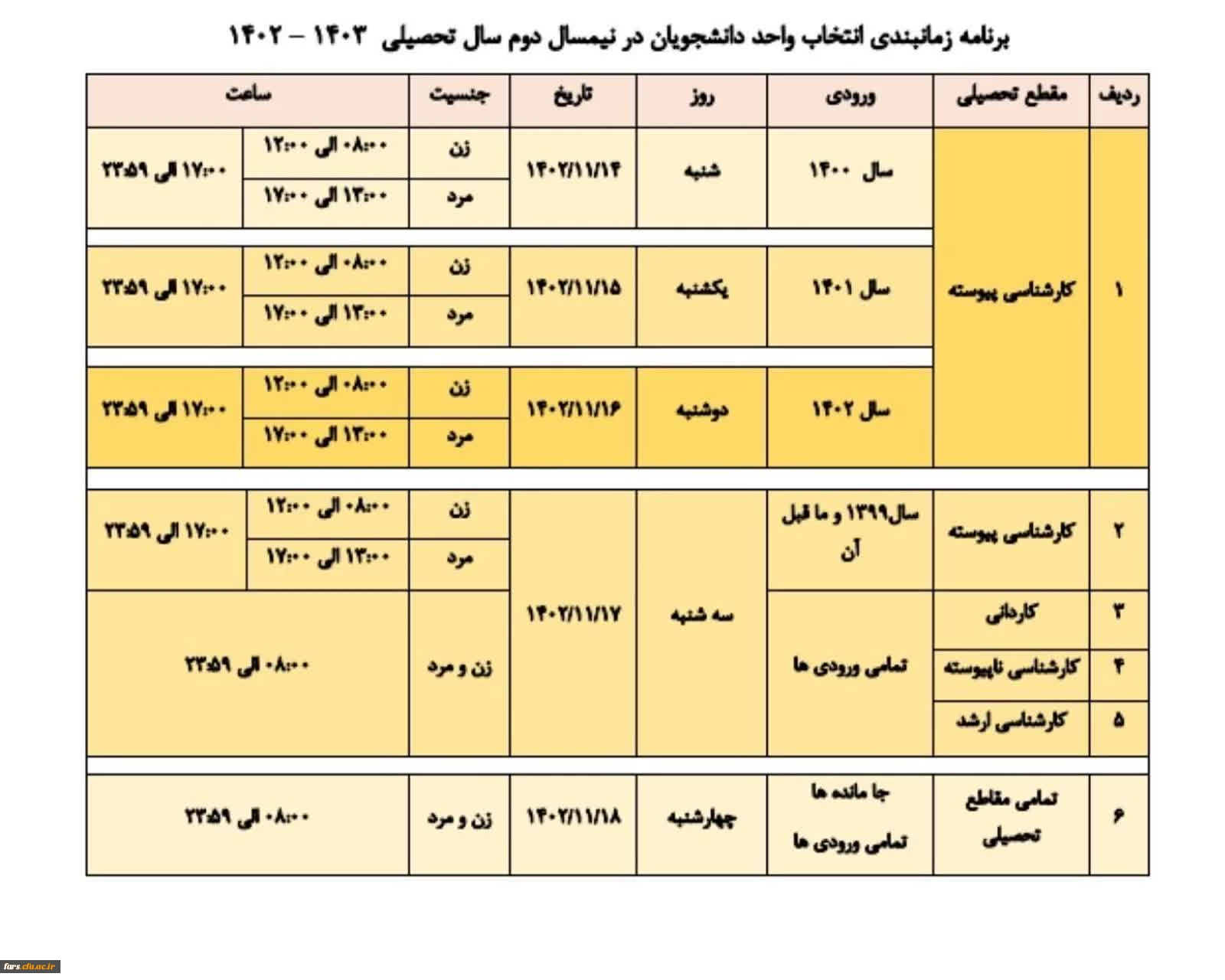 امتیاز دهید : برنامه زمانی انتخاب واحد دانشجویان در نیم سال دوم 1402-1403 3 چهارشنبه 11 بهمن 1402 ساعت 10:50