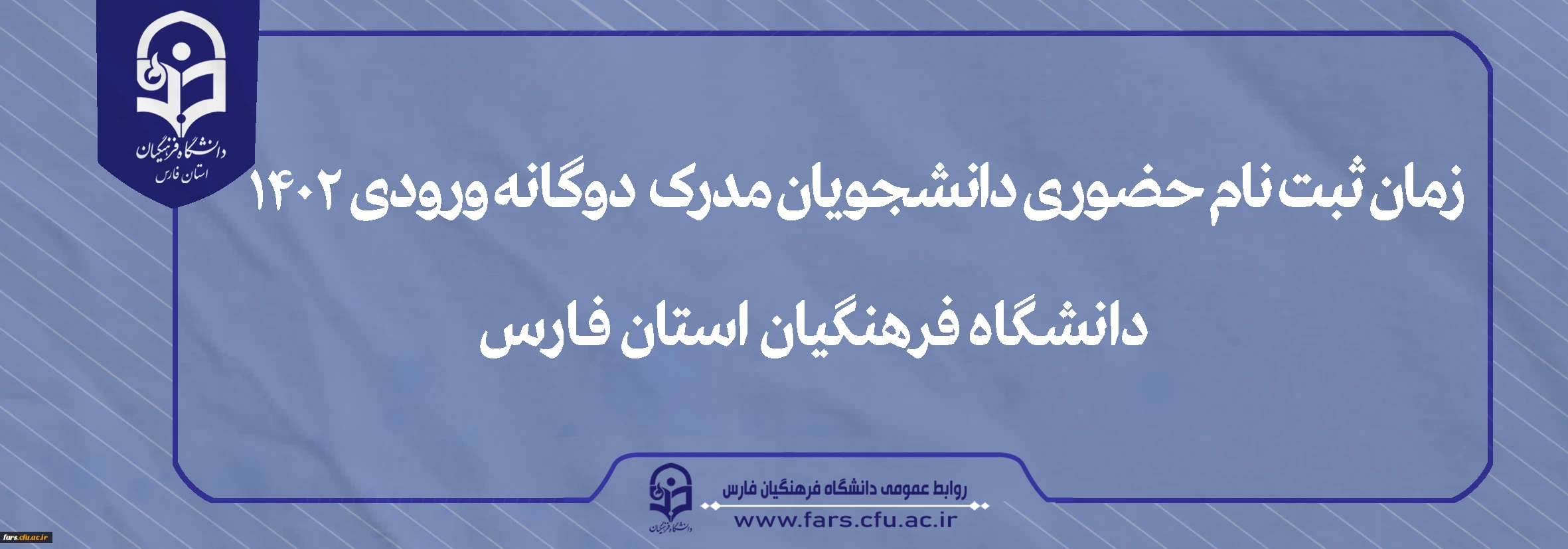 زمان ثبت نام حضوری دانشجویان مدرک دوگانه ورودی 1402با هدف احراز هویت و اطمینان از ادامه تحصیل در دانشگاه فرهنگیان پردیس شهید رجایی شیراز 2